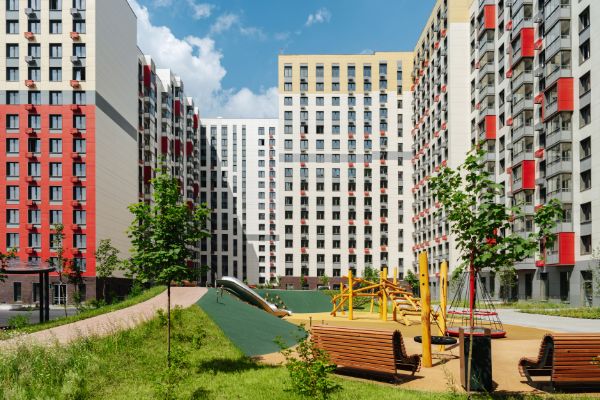 Детям будет чем заняться на спортивной и игровой площадках с качелями, горками и развивающими пространствами.
